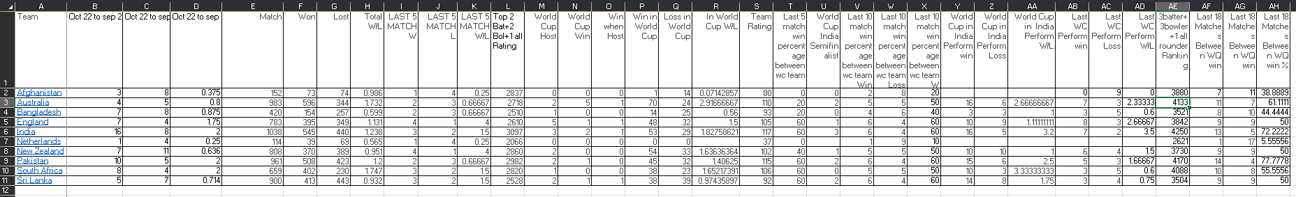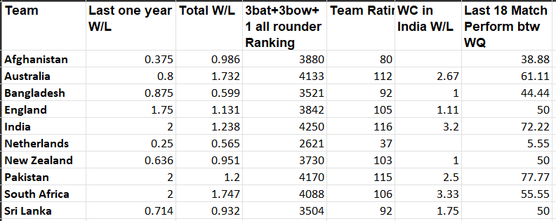 So, what we have here, total seven columns i.e. Team, last one year W/L (mean Oct 2022 to Sep 2023), Total W/L(win loss ratio from 1st international match to till day), seven player rating(seven impact players mean 3 batsman, 3 bowlers and one allrounder from each team and sum of their rating), team rating (as per ICC Team Ranking), W/C in India W/L (1987, 1996 & 2011: all 3 world cup each team win loss ratio), last 18 match perform ( Last 18 matches performance each team against world cup participate team), every team will play at least 09 league match.