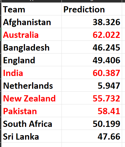 Therefore, based on the available information and predictions of my machine learning model, it seems that Australia, India, New Zealand and Pakistan are the most likely teams to reach the semi-final of World Cup ODI 2023. However, cricket is a game of uncertainties and anything can happen on any given day. The other teams will also try their best to upset the favourites and create history. The World Cup ODI 2023 promises to be an exciting and thrilling tournament that will showcase some of the best cricketing talent in the world.